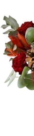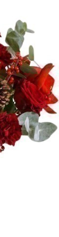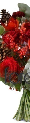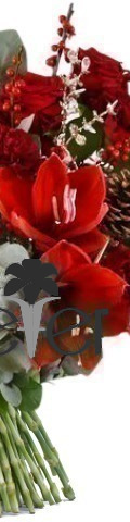 6 x Red Amaryllis, 3 x Red Roses, 3 x Red Carnations, Red Hypericum Berries, 2 x Pine Cones, Eucalyptus