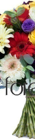 A fabulous fusion of Mother Nature's most vibrant and colourful blooms, the Bunting Beauty Handtied Bouquet will deliver a kaleidoscope of colour straight to the recipient's door. With 4 red gerberas, 3 yellow roses, 1 blue hydrangea, 5 purple lisianthus, white and yellow gerberas, 2 cream carnations, and lush green foliage, it is a birthday bouquet or Mother's Day gift that stands out and demands attention.