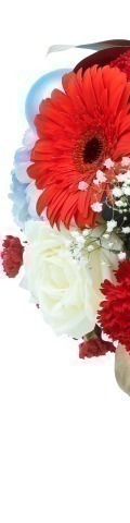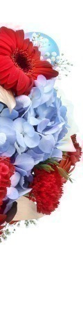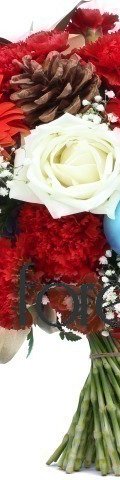 1 Blue Hydrangea, 5 Red Carnations, 4 Red Gerbera, 2 White Roses, 4 Blue Baubles